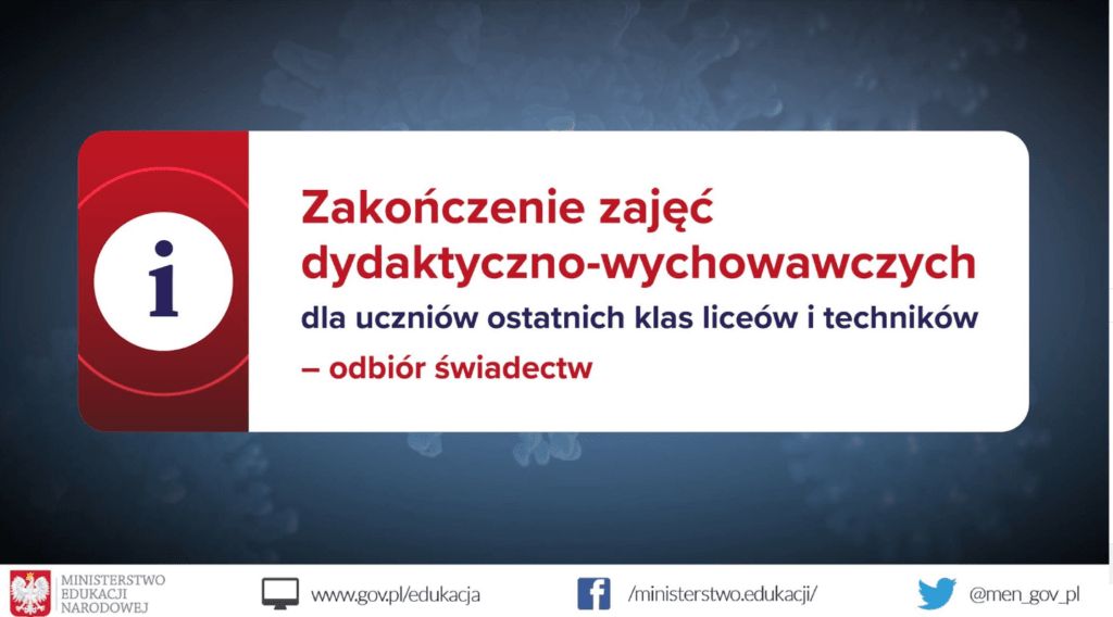 W związku z rozprzestrzenianiem się pandemii koronawirusa na terenie Polski MEN zdecydowało się zmienić harmonogram egzaminów uczniów klas ósmych oraz maturzystów. Początkowy harmonogram egzaminów zaplanowanych odpowiednio na kwiecień i maj nie pozwala na zapewnienie maksymalnego bezpieczeństwa. Koniecznym zatem jest wprowadzenie zmian w harmonogramie egzaminów. Skutkuje to przełożeniem egzaminów i matur na co najmniej drugą połowę […]