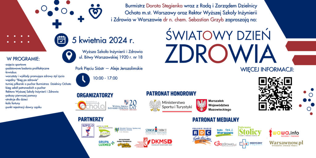 Bieg po zdrowie, badania, warsztaty i wiele innych atrakcji podczas Światowego Dnia Zdrowia. 7 kwietnia obchodzimy Światowy Dzień Zdrowia z tej okazji już 5 kwietnia Wyższa Szkoła Inżynierii i Zdrowia w Warszawie wraz z Urzędem Dzielnicy Ochota m.st Warszawa w ramach obchodów tego święta zaplanowała liczne atrakcje. Wydarzenie zaplanowane jest na 5 kwietnia i odbywać […]